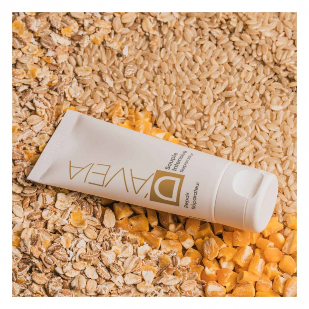- Aveia, rica em proteínas e polissacáridos, que promove uma ação hidratante e anti-irritante