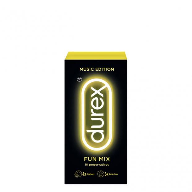 Durex Music Edition Fun Mix contém preservativos masculinos em látex. Fabricados em material dermatologica- e electronicamente testados, são lubrificados e com depósito (excepto a versão de sabor). Ajustam-se anatomicamente, tornando a relação íntima cómoda e segura.