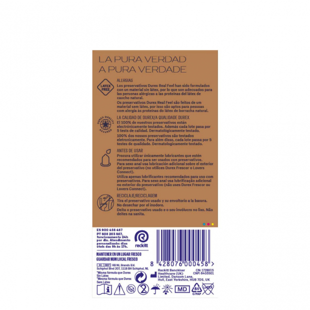 Verifica a data de validade antes de utilizar e segue sempre as instruções que se encontram no folheto informativo que acompanha as embalagens de Durex Real Feel Preservativos.