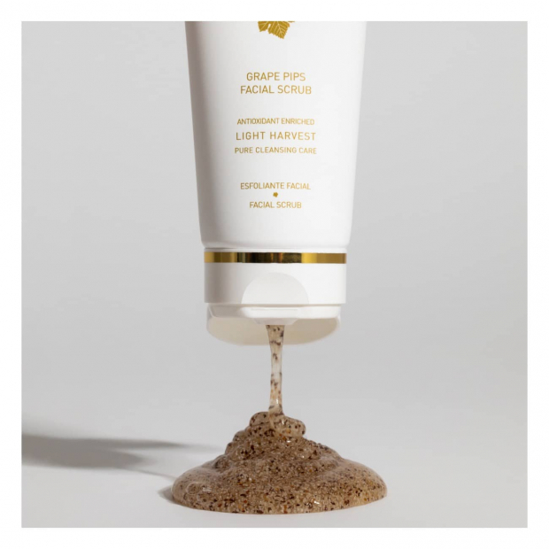 - Contém grainhas de uva e arando e microesferas e ésteres de jojoba e candelila para uma esfoliação física