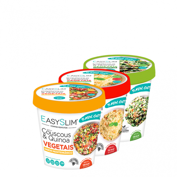 Easyslim Couscous Quinoa Vegetais Cogumelos é a proposta ideal para almoço e jantar, de preparação rápida e deliciosa. Com couscous, quinoa, vegetais e cogumelos, tem uma preparação rápida e quente. Como inclui garfo é ideal para levar consigo de fim-de-semana, para o trabalho ou qualquer sítio onde possa juntar água quente.