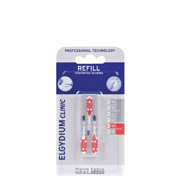 Elgydium Clinic Escovilhões Recargas Vermelho são recargas para espaços interdentários largos. Com um diâmetro de 1.5mm, são quase a medida máxima usada pela marca para espaços interdentários largos (acima só mesmo as Recargas Roxo com 1.8mm de diâmetro). Compatível com os escovilhões Elgydium Clinic Trio Compact e Elgydium Clinic Flex.
