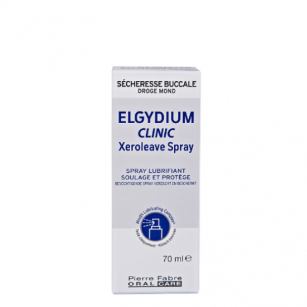 Elgydium Clinic Xeroleave Spray é um spray que substitui a saliva em situações de ausência de saliva (hipossialia ou assialia), resultante de algumas medicações ou radioterapia, ou mesmo associada ao envelhecimento. Lubrifica a mucosa oral e alivia de imediato o desconforto da boca seca. Sabor neutro. Sem álcool, sem LSS, sem aromas artificiais e sem corantes.