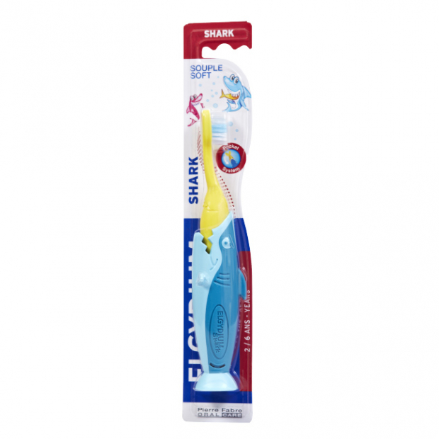 Elgydium Kids Escova de Dentes é uma escova de dentes para crianças com uma cabeça pequena, concebida especialmente para a boca pequena das crianças. Com cerdas suaves e arredondadas, esta escova está concebida para uma lavagem suave dos dentes e gengivas das crianças. Para crianças dos 2 aos 6 anos. Edição especial Shark.