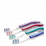 Com cerdas de diferentes alturas para uma limpeza completa. Filamentos suaves, adapta-se a quem tem gengivas frágeis ou sensíveis. Esta escova tem a particularidade de dobrar a meio, ou seja, o seu cabo fecha sobre si próprio e protege as cerdas. Ideal para levar para o trabalho ou de viagem.
