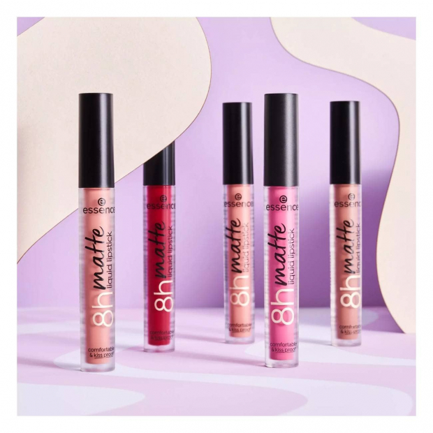 Essence 8h Matte Batom Líquido tem uma textura leve e confortável, uma fórmula mate aveludada de longa duração e um acabamento à prova de água e à prova de beijo.