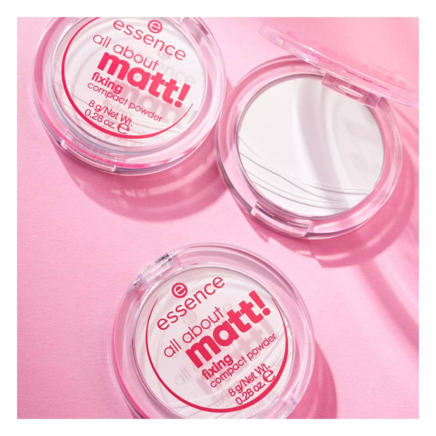 Essence All About Matt! Pó Compacto Fixador é perfeito para retoques durante o dia, graças à sua textura ultra fina e fórmula translúcida matificante.