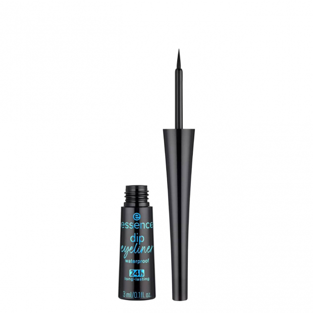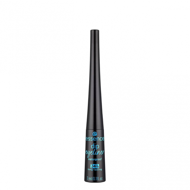 Essence Dip Eyeliner Líquido Waterproof 24h tem uma textura fluida e uma cor preta intensa, com acabamento mate.