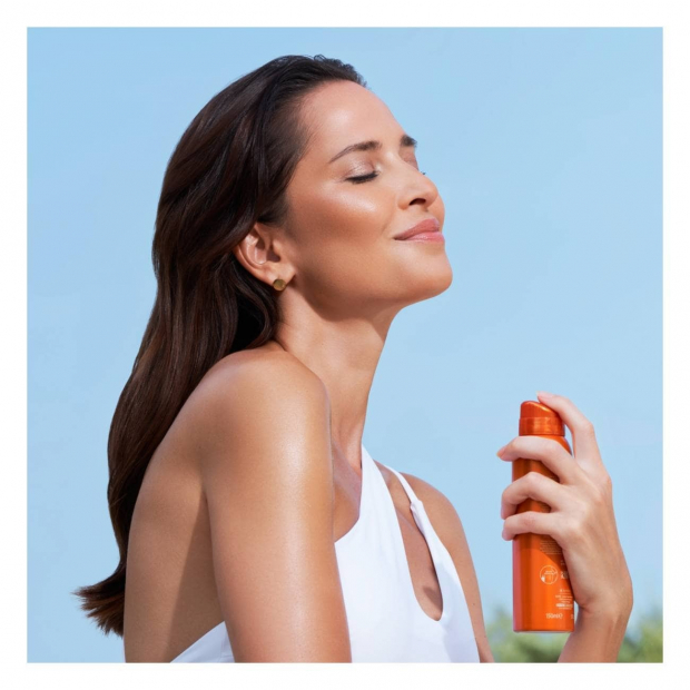 Esta bruma prepara a pele do rosto e corpo para a exposição solar, ativando o processo natural de pigmentação e melhorando a resistência da pele ao sol, enquanto previne o envelhecimento cutâneo.