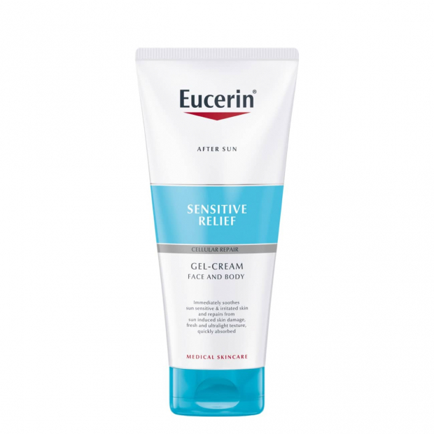 Eucerin After Sun Sensitive Relief Gel-Creme tem uma textura em gel-creme, ainda mais leve e fresca, com um complexo Cellular Repair que repara o DNA da pele para reduzir os danos causados pela exposição solar.
