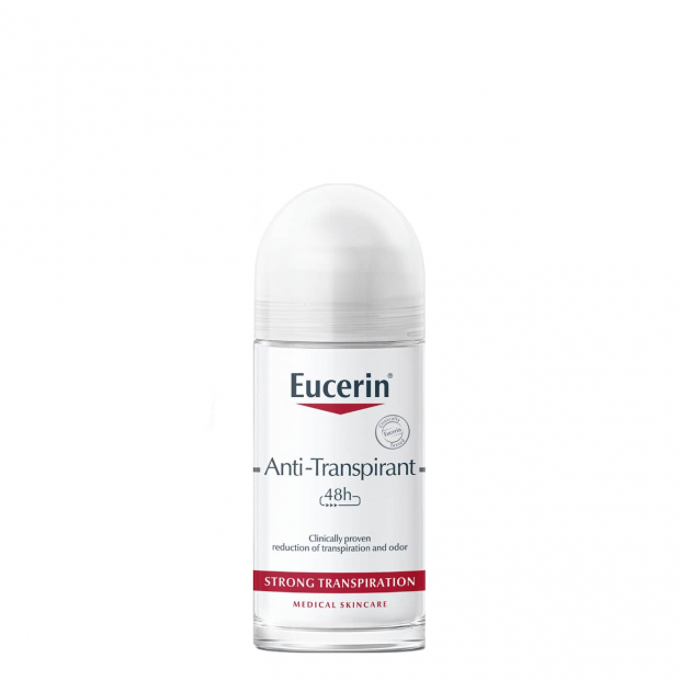 Eucerin Anti-Transpirante Roll-On Transpiração Forte 48h contém sais de alumínio, que bloqueiam a transpiração, evitando o suor e os maus odores.