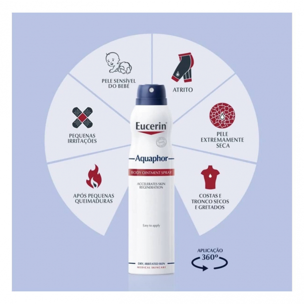 Agita bem antes de usar. Vaporiza Eucerin Aquaphor Spray Regenerador na zona da pele afetada, sempre que necessário, a uma distância mínima de 10cm. Podes massajar ou deixar atuar sem espalhar.