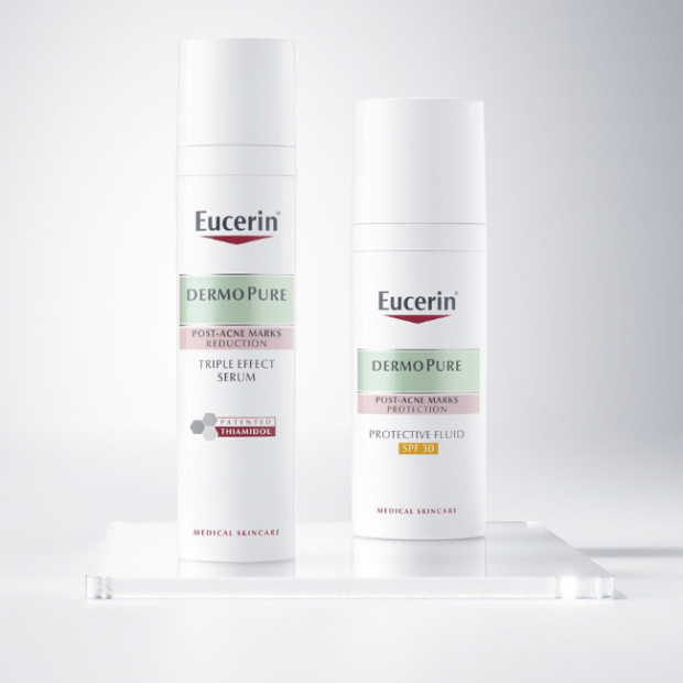 Eucerin Dermopure Oil Control Sérum Triplo Efeito tem uma textura fluida, com uma combinação de thiamidol®, ácido salicílico, licochalcone A e tecnologia seborreguladora, para uma ação anti-marcas, anti-oleosidade, anti-vermelhidão e matificante.