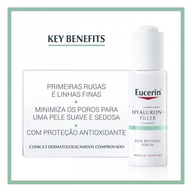 Eucerin Hyaluron-Filler Skin Refining Sérum tem uma textura ultraleve,