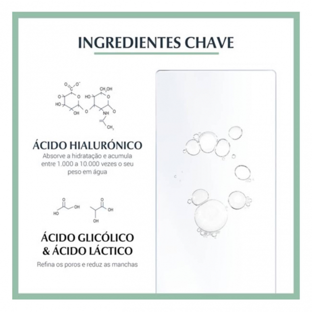 - Ácido glicólico, um alfa-hidroxiácido, que melhora a textura e uniformiza o tom de pele