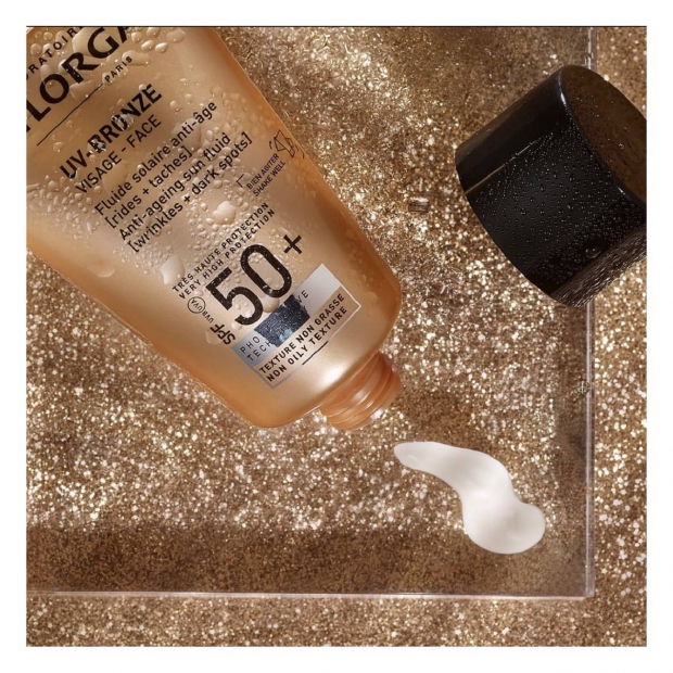 Filorga UV Bronze Fluido Rosto SPF50+ tem uma textura fundente leve, com efeito mate e uma aroma suave a monoi.