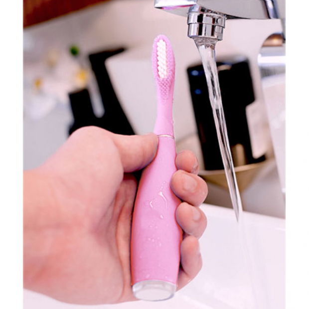 Escova de dentes elétrica, de silicone e pulsações sónicas, para a higiene oral diária. Cor rosa.