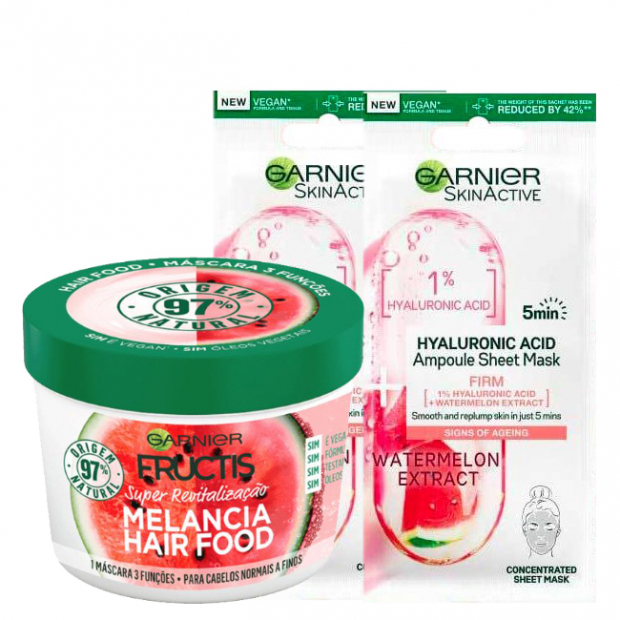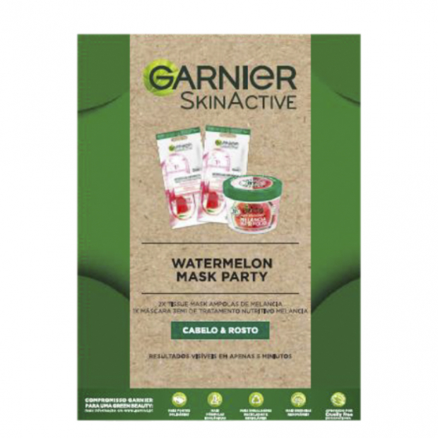 Garnier Watermelon Mask Party é um kit com 2 cuidados: 2 Máscaras de Tecido Reafirmantes e Preenchedoras e 1 Máscara 3-em-1 de Cabelo Revitalizante (390ml).