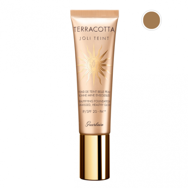 Guerlain Terracotta Joli Teint Base Iluminadora é uma base, que ajuda a proporcionar a cobertura perfeita, enquanto ilumina para uma tez radiante “beijada pelo sol”. Garante uma cobertura média, com um acabamento sedoso, sem sensação de oleosidade. Dá à pele uma luminosidade suave, quente e natural para uma tez bronzeada. Cobre as imperfeições e atenua os sinais de fadiga. Proporciona proteção solar média (FPS20). Fragrância floral exótica e suave a tiaré.