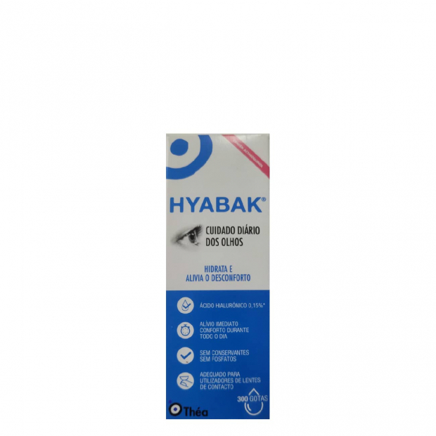 Hyabak Cuidado Diário Dos Olhos são gotas oftálmicas que ajudam a hidratar, lubrificar e proteger os olhos secos e cansados, mesmo os utilizadores de lentes de contacto. Proporciona alivio imediato. Forma uma película protetora contra as agressões externas como vento, fumo, poluição, pó, ar condicionado, viagens de avião ou computador que provocam secura.