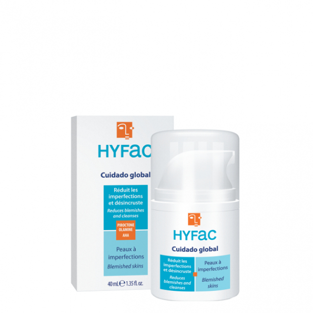 Hyfac Creme Global Anti-Imperfeições contém ácido glicólico, poderoso agente queratolítico, provoca a queda da camada superficial da epiderme, reduzindo a espessura da pele. Os estéres de alfa-hidroxiácidos (A.H.A.), agentes esfoliantes, ajudam a eliminar as células mortas e a evitar a obstrução dos poros, prevenindo a formação de pontos negros. A olamina-piroctona é antifúngica e antibacteriana. As microsferas de poliamida absorvem o excesso de sebo. Os agentes hidratantes, como a glicerina, deixam a pele confortável.