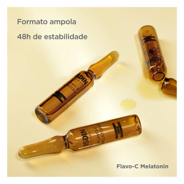 Isdin Flavo C Melatonin Sérum é um sérum concentrado em ampolas, com melatonina, bakuchiol e vitamina C para uma ação estimulante, antioxidante, anti-idade, reafirmante e iluminadora.