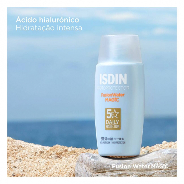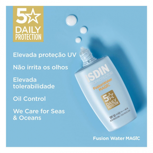 Isdin Fotoprotector Fusion Water Magic SPF50 tem uma textura ultraligeira de absorção imediata, que não deixa resíduo oleoso.