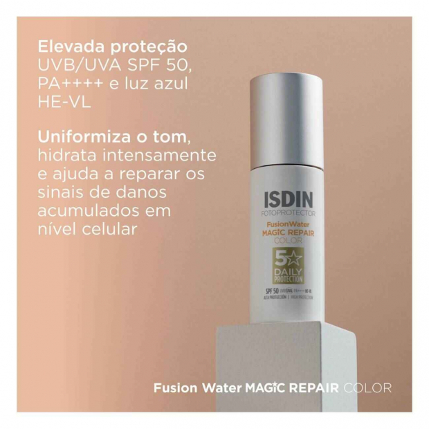 Isdin Fotoprotector Fusion Water Magic Repair Color SPF50 tem uma textura fluida numa base de água (fusion water) para uma absorção rápida, sem sensação oleosa. Com um acabamento sedoso e sem deixar brilhos ou resíduos.