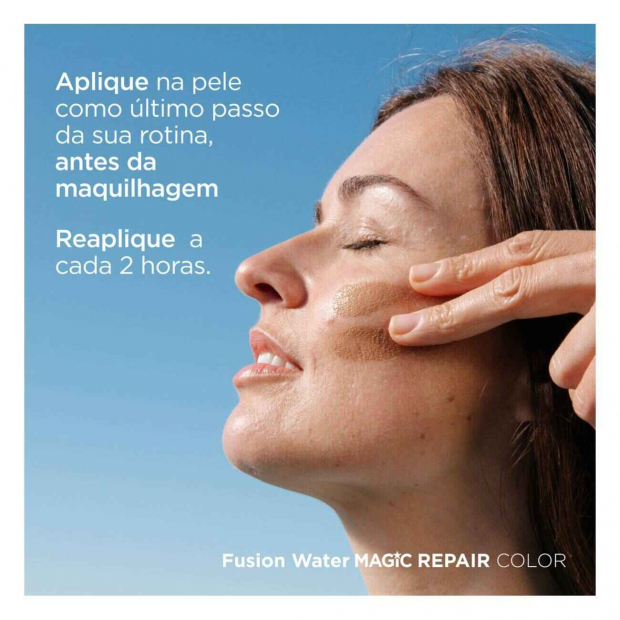 Aplica Isdin Fotoprotector Fusion Water Magic Repair Color SPF50 sobre a pele limpa e seca, meia hora antes da exposição solar e como último passo da tua rotina de skincare, antes da maquilhagem se for o caso. Reaplica a cada 2 horas ou sempre que transpirares, nadares ou secares com a toalha.