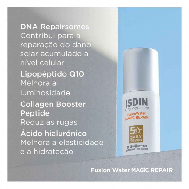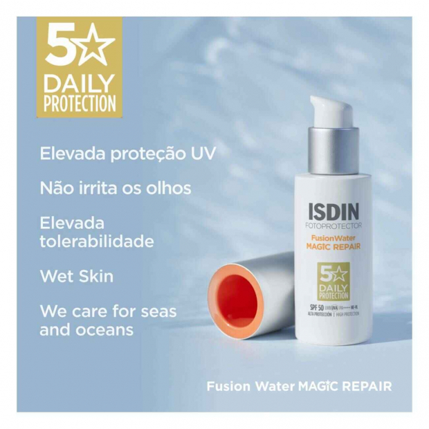 Isdin Fotoprotector Fusion Water Magic Repair SPF50 tem uma textura fluida numa base de água (fusion water) para uma absorção rápida, sem sensação oleosa. Com um acabamento sedoso e sem deixar brilhos ou resíduos.