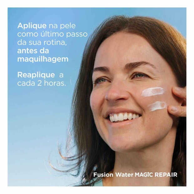 Aplica Isdin Fotoprotector Fusion Water Magic Repair SPF50 sobre a pele limpa e seca, meia hora antes da exposição solar e como último passo da tua rotina de skincare, antes da maquilhagem se for o caso. Reaplica a cada 2 horas ou sempre que transpirares, nadares ou secares com a toalha.