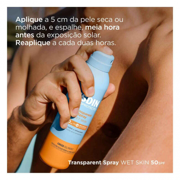 Isdin Fotoprotector Wet Skin FPS50 tem uma textura em bruma, leve e transparente, com: