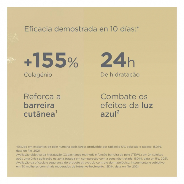 Os testes clínicos (em 30 voluntárias com sinais moderados de fotoenvelhecimento) mostram que após 1 frasco, o volume das rugas é reduzido e a luminosidade da pele restaurada!