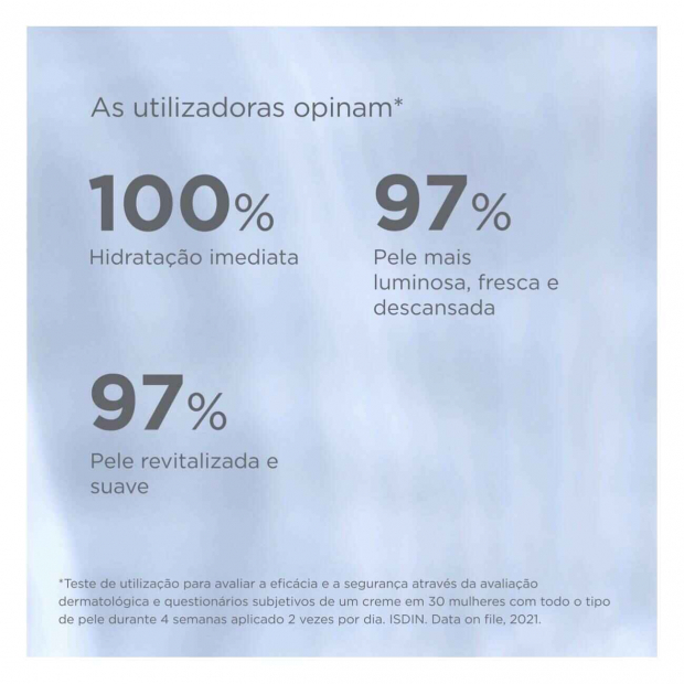ISDIN Isdinceutics Hyaluronic Moisture Sensitive tem uma textura leve e uma fórmula com 80% de ingredientes de origem natural.