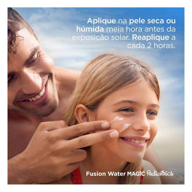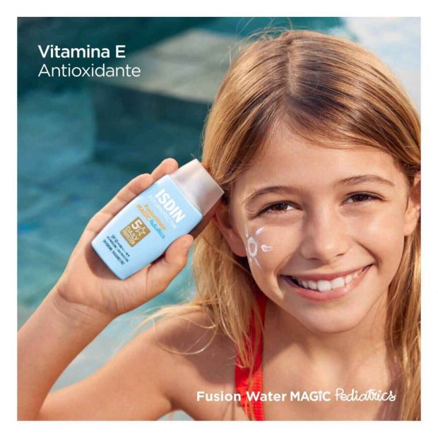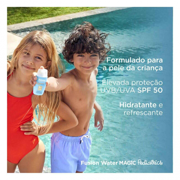 Isdin Pediatrics Fusion Water Fotoprotetor Solar SPF50 tem uma textura ultraligeira, que combina: