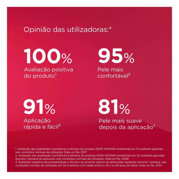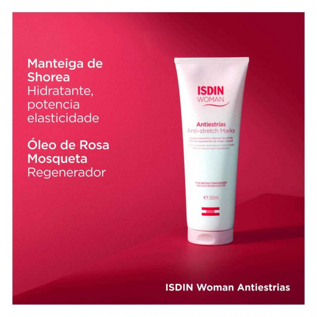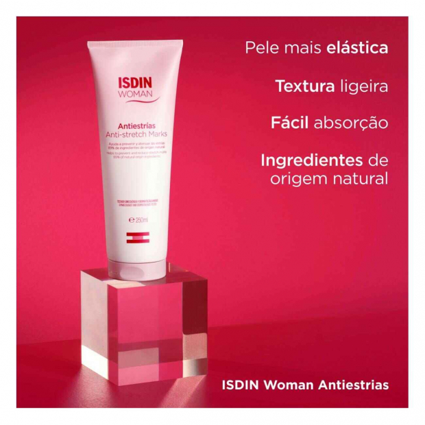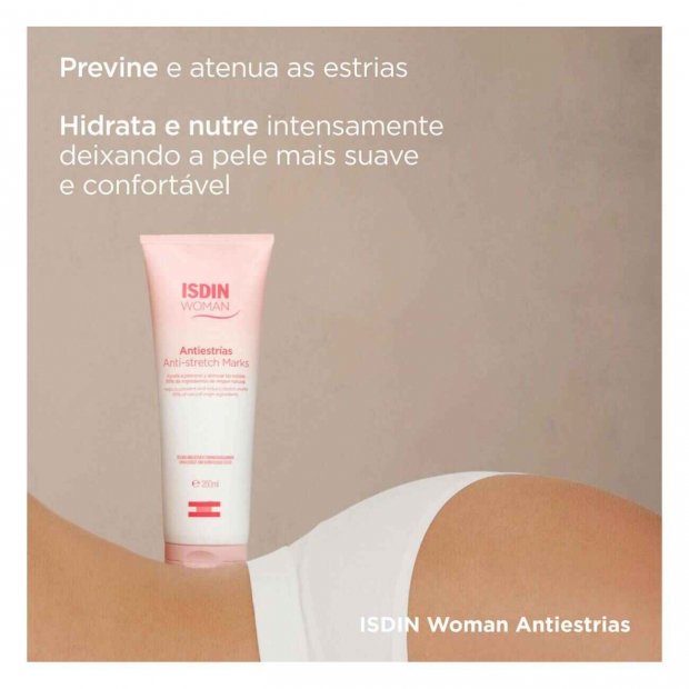 Isdin Woman Creme Anti-Estrias tem textura rica e fundente, proporcionando uma experiência sensorial.
