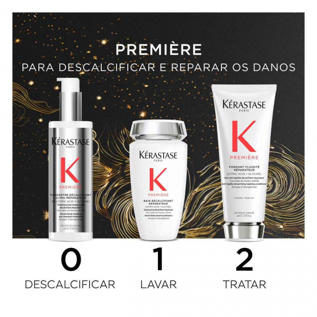 - Kérastase Première Concentré Décalcifiant Ultra-Réparateur Tratamento Pré-Shampoo é um cuidado concentrado, para utilizar antes do shampoo, que devolve a elasticidade e o brilho ao cabelo