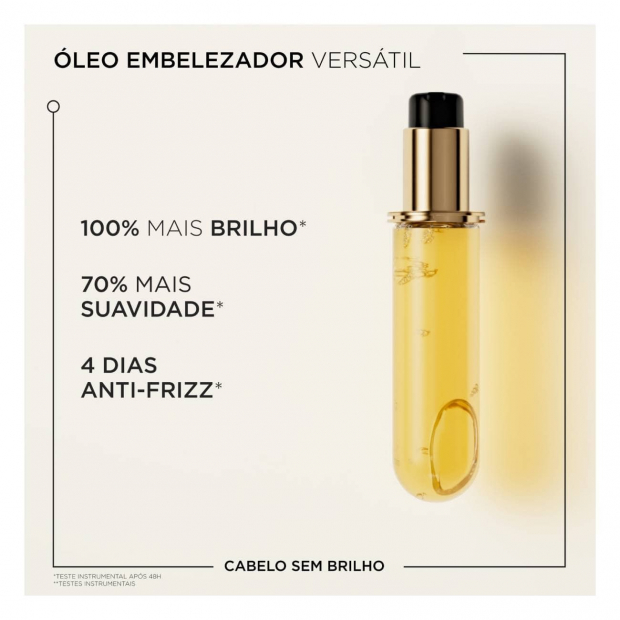 Óleo capilar nutritivo e iluminador, controla o frizz e intensifica o brilho para cabelos baços ou com frizz.