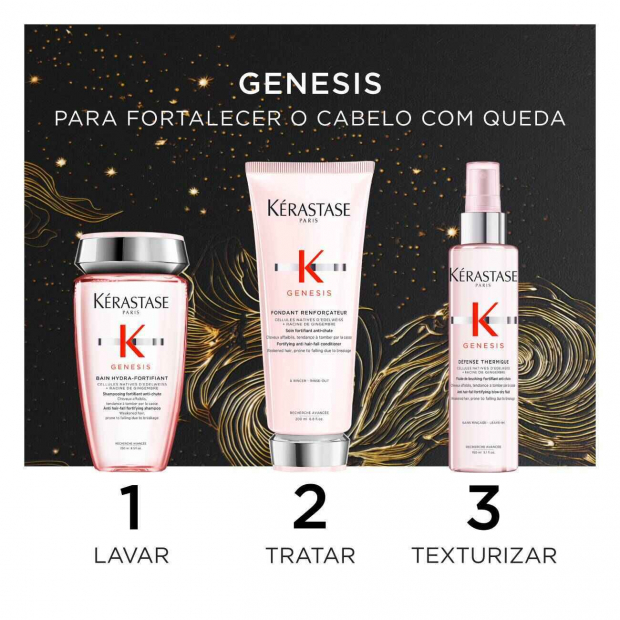 - Kérastase Genesis Fondant Renforçateur é um condicionador que hidrata intensamente, sem pesar e fortalece a fibra contra a queda, prevenindo futuros danos.