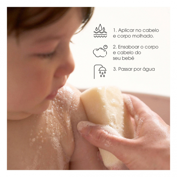 Este sabonete sólido lava suavemente a pele do bebé sem irritar ou secar e, ao mesmo tempo, lava os cabelos delicados.