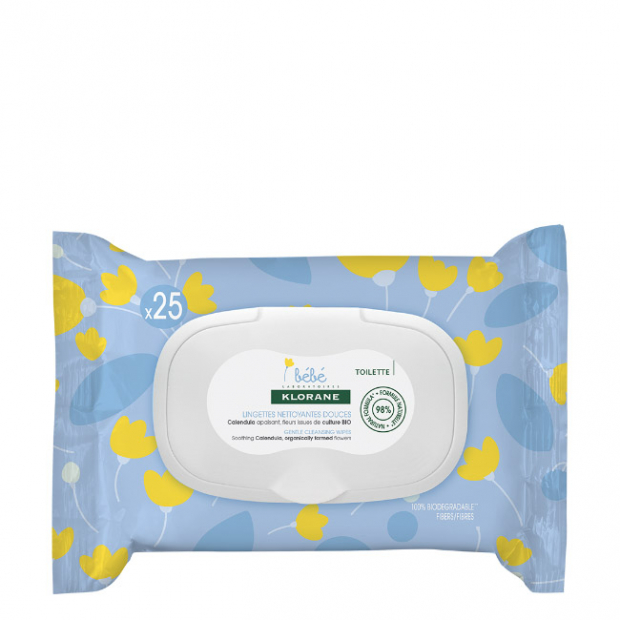 Klorane Bebé Toalhitas são toalhitas de fibra natural, com 98% de ingredientes de origem natural: extrato de calêndula para uma ação de limpeza suave, calmante, hidratante e suavizante.