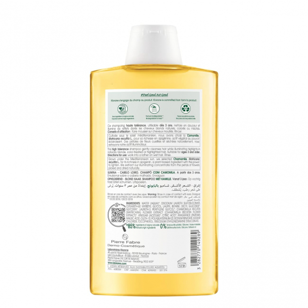 Klorane Camomila Shampoo tem uma textura fluida e suavemente perfumada, rica em: