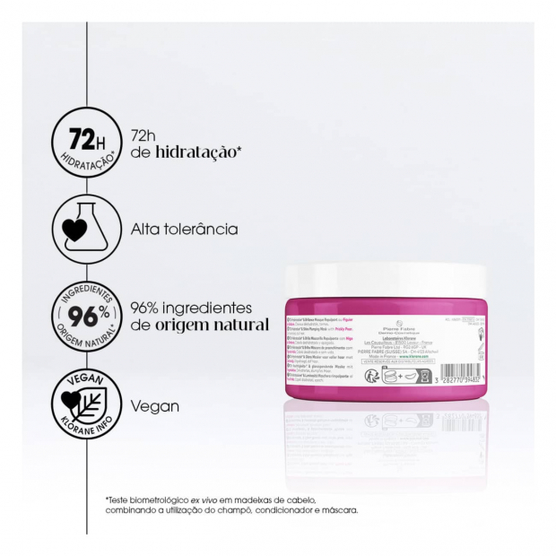 - Rico em Figo da Índia, cultivado no México, que absorve, armazena e retém a água no centro da fibra capilar, para hidratar sem pesar e ajudar a selar as cutículas capilares, restaurando o brilho