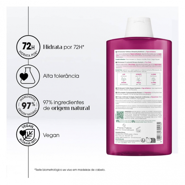 - Rico em Figo da Índia, cultivado no México, que absorve, armazena e retém a água no centro da fibra capilar, para hidratar sem pesar e ajudar a selar as cutículas capilares, restaurando o brilho