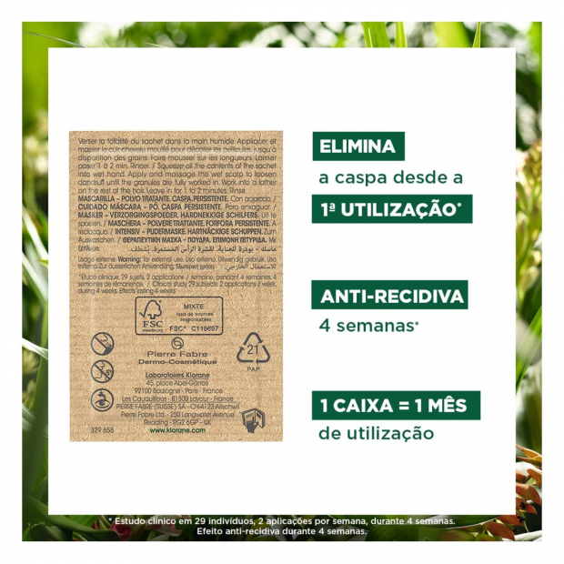 Uma máscara de tratamento em pó que elimina eficazmente a caspa visível (até 100%), de forma imediata e duradoura. Enquanto isso, vai devolver ao couro cabeludo todo o seu conforto e equilíbrio essenciais.
