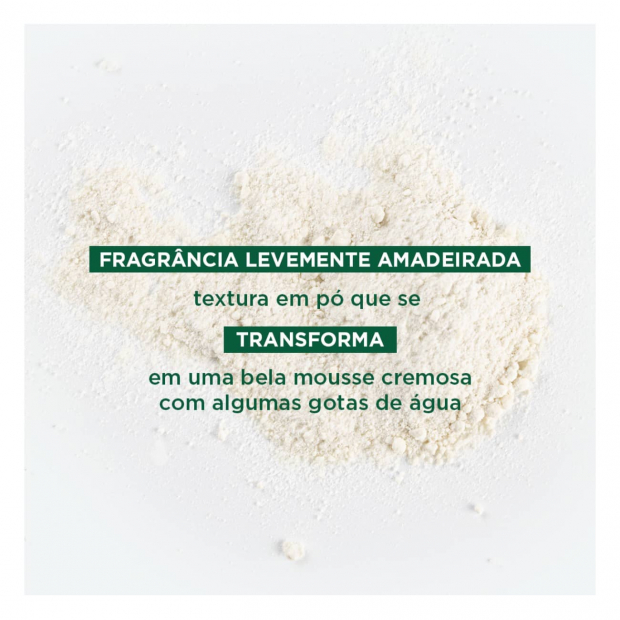 Klorane Galanga Máscara em Pó Anticaspa tem uma fórmula em pó que se transforma numa espuma cremosa em contacto com a água, rica em ingredientes naturais: