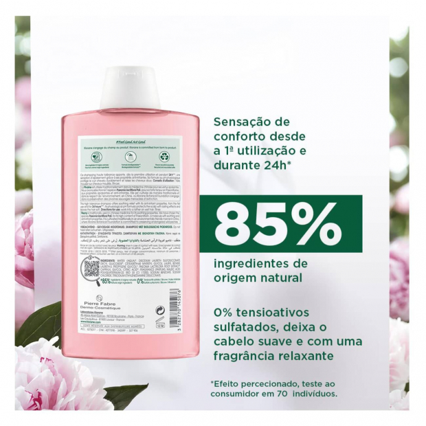 Klorane Peónia da China Shampoo tem uma textura fluída, formulada à base de: