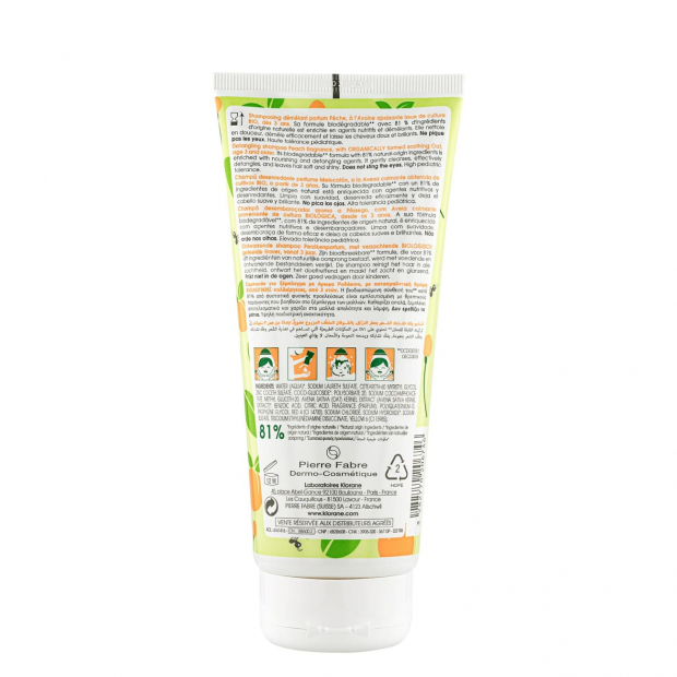 Klorane Junior Pêssego Shampoo tem uma base lavante suave, com leite de sementes de algodão, lipoproteínas e vitamina B, para uma ação de limpeza, nutritiva, suavizante, desembaralante, fortificante e estimulante.