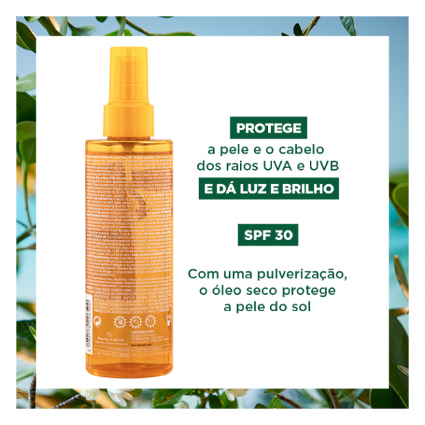 Klorane Polysianes Solar SPF30 Óleo Seco contém 4 filtros solares, não ecotóxicos, para que possa proteger a pele sem agredir o meio ambiente. Contém Tamanu Bio e Monoi para um efeito iluminador e embelezador da pele.