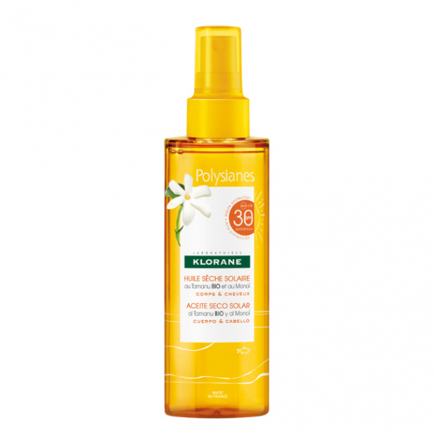 Klorane Polysianes Solar SPF30 Óleo Seco é um protetor solar em óleo com uma textura não gordurosa que se adapta ao corpo e ao cabelo para uma proteção eficaz contra os raios UVA e UVB.